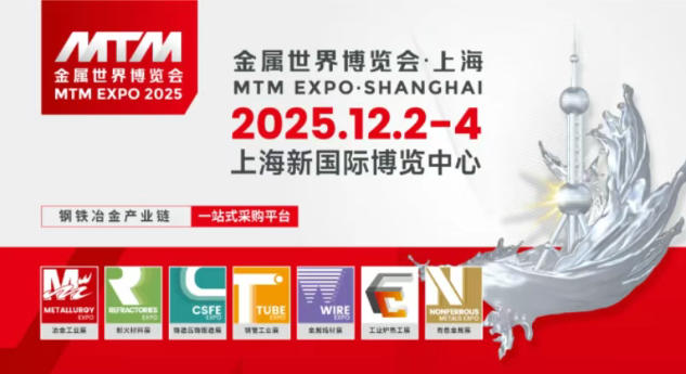 由全联冶金商会、宝山钢铁股份有限公司、中国耐火材料行业协会、中国机械工程学会工业炉分会、中国钢结构协会钢管分会、上海市金属学会、上海钢管行业协会、天津市线材制品行业协会、上海申仕展览服务有限公司等单位联合主办的“2025金属世界博览会”(MTMEXPO)将于2025年12月2日-4日在上海新国际博览中心盛大举办。